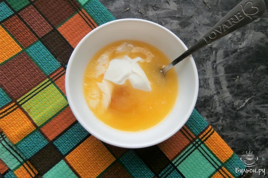 4. 50 г сливочного масла растопить в микроволновке или на газу, добавить 1 ст. л. меда (жидкого),2 ч. л. сметаны, тщательно все смешать.