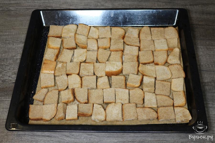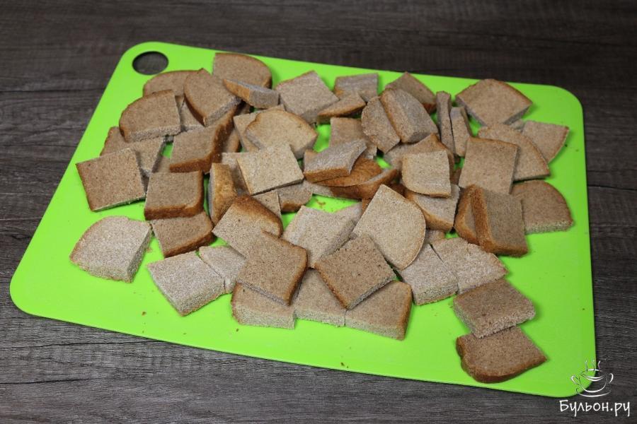 1. Уже несвежий ржаной хлеб нарезаем на кусочки. Чтобы не возникли проблемы с посыпкой сыра на хлеб, размер кусочков должен быть крупный или средний.