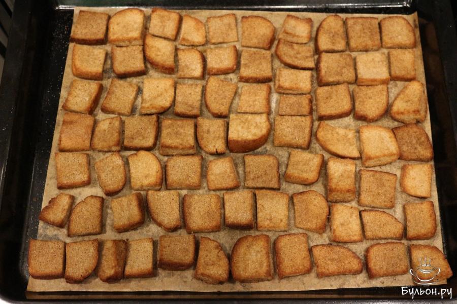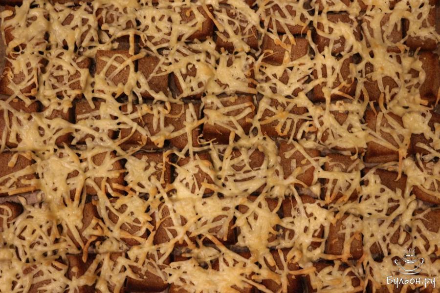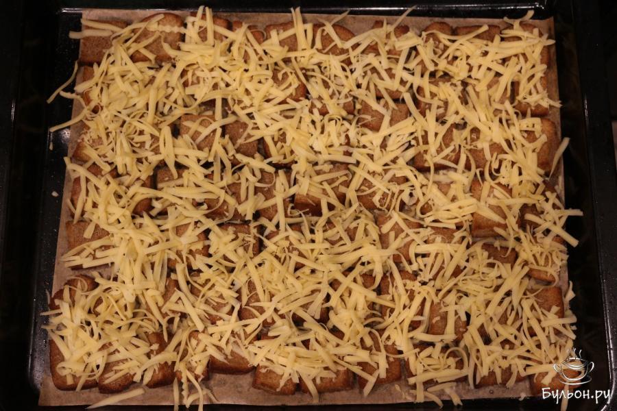 5. Сыр трем на терке с крупными отверстиями. По истечении 20 минут, посыпаем тертым сыром сухарики, которые отправляем снова в духовку буквально на 5-7 минут. Но сушим их уже при 250 градусах.