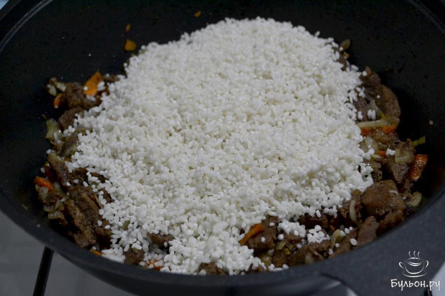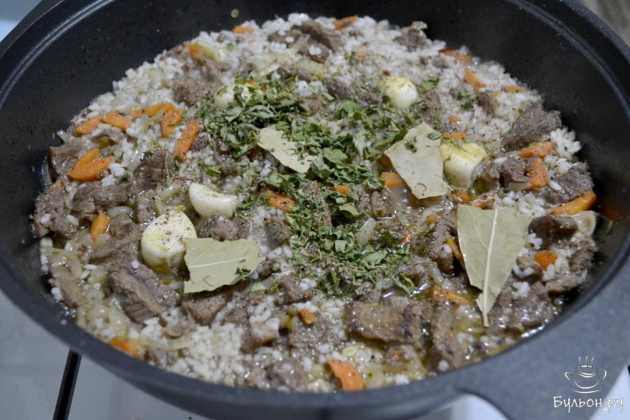 8. Влейте горячую воду. Закройте казан крышкой и доведите до кипения. Затем сделайте огонь минимальным и готовьте плов в течение 25 минут.