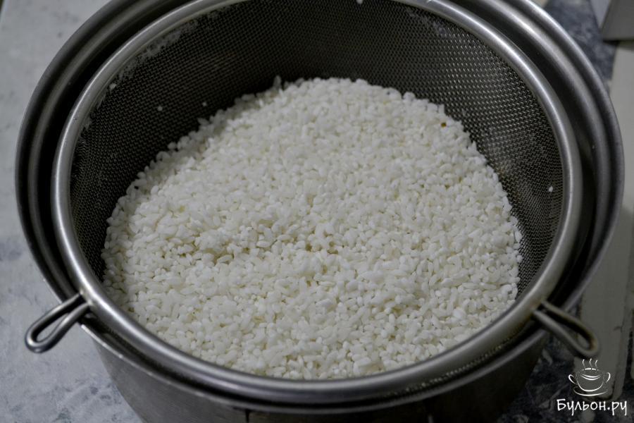 5. Промойте рис, меняя воду несколько раз, до тех пор, пока она не будет прозрачной, затем откиньте рис на дуршлаг, чтобы вся вода стекла.