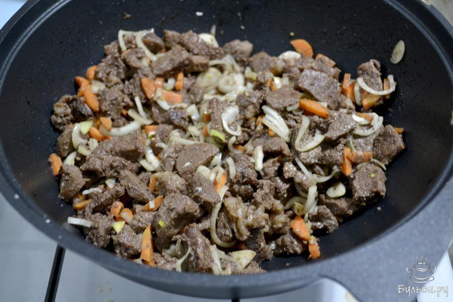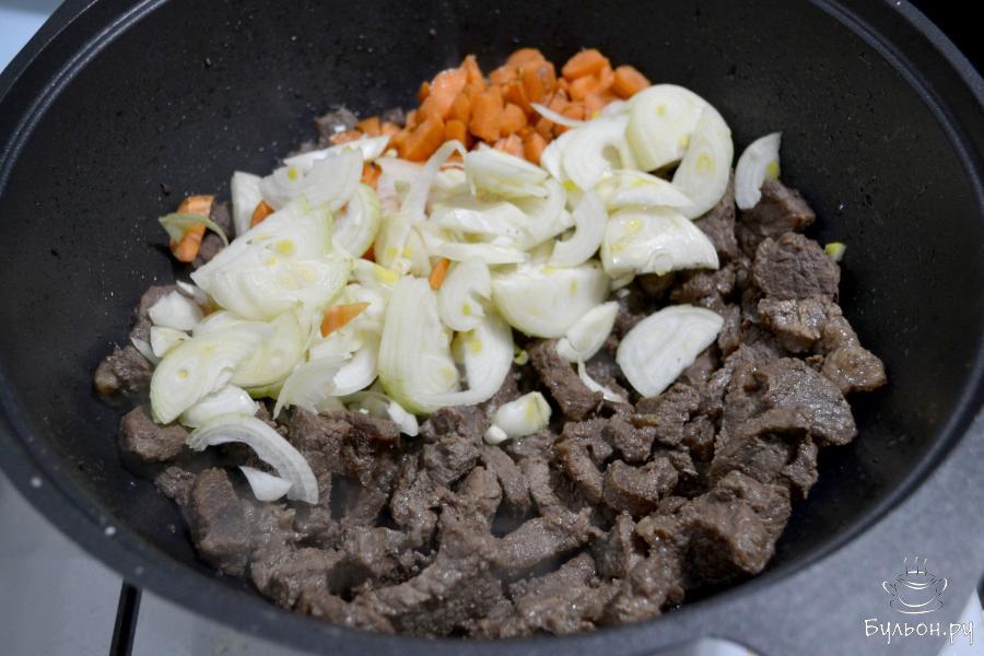 3. Когда мясо будет почти готово и жидкость почти вся выпарится, положите в казан нарезанные овощи: лук и морковь.