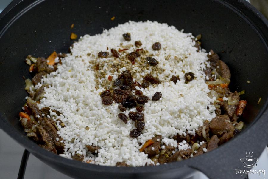 7. Следом отправьте чеснок, промытый изюм без косточек, немного измельченные семена кориандра, щепотку острого красного перца, посолите.