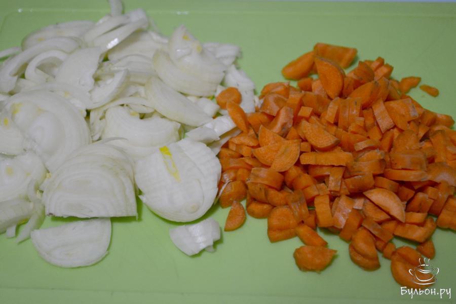 2. Очистите от шелухи лук и от кожуры морковь. Лук нарежьте полукольцами, морковь тонкими кусочками.