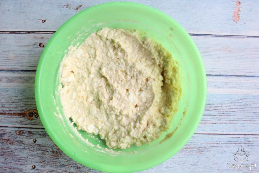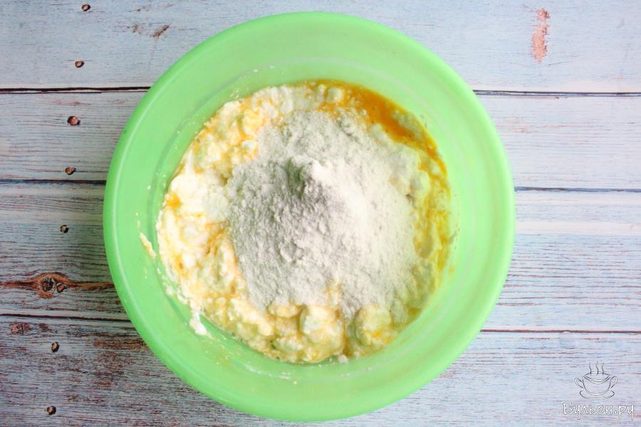 3. Добавляем к творогу муку, но не всю (оставляем немного для посыпки сырников), соль и разрыхлитель.