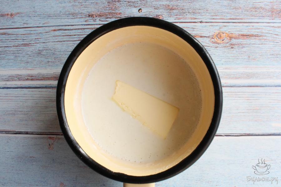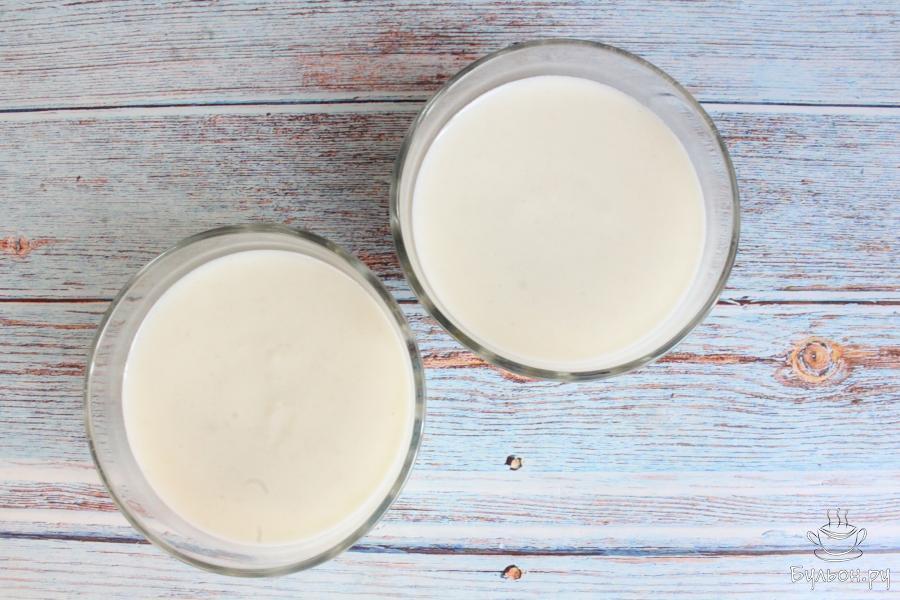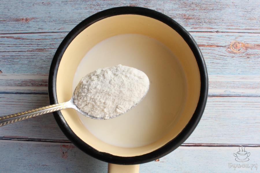 1. В сотейник или ковш вольем молоко, добавим рисовую муку, хорошо размешиваем и ставим посуду на маленький огонь. Варим десерт до легкой густоты, постоянно помешиваем.