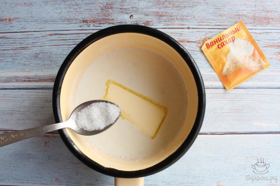 2. Затем добавляем в десерт соль, сахар (сразу весь сахар добавлять не надо, пробуем на вкус), продолжаем варить.