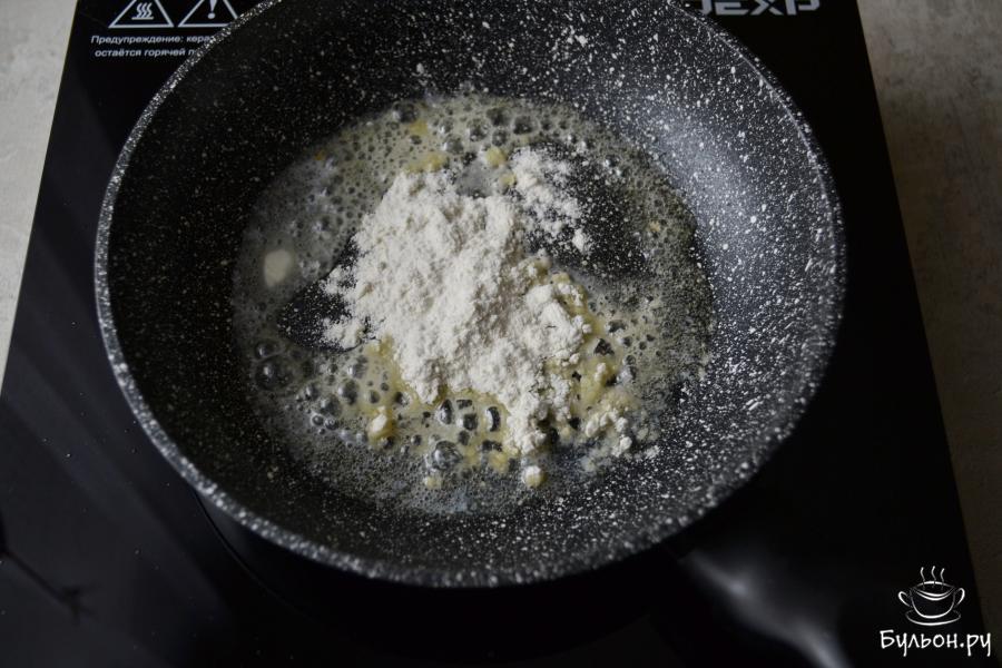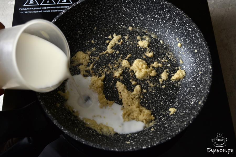 3. Обжарьте муку 2-3 минуты до легкого золотистого цвета и влейте тонкой струйкой примерно половину молока. Сразу же лопаткой растирайте муку с молоком, чтобы не образовались комочки.