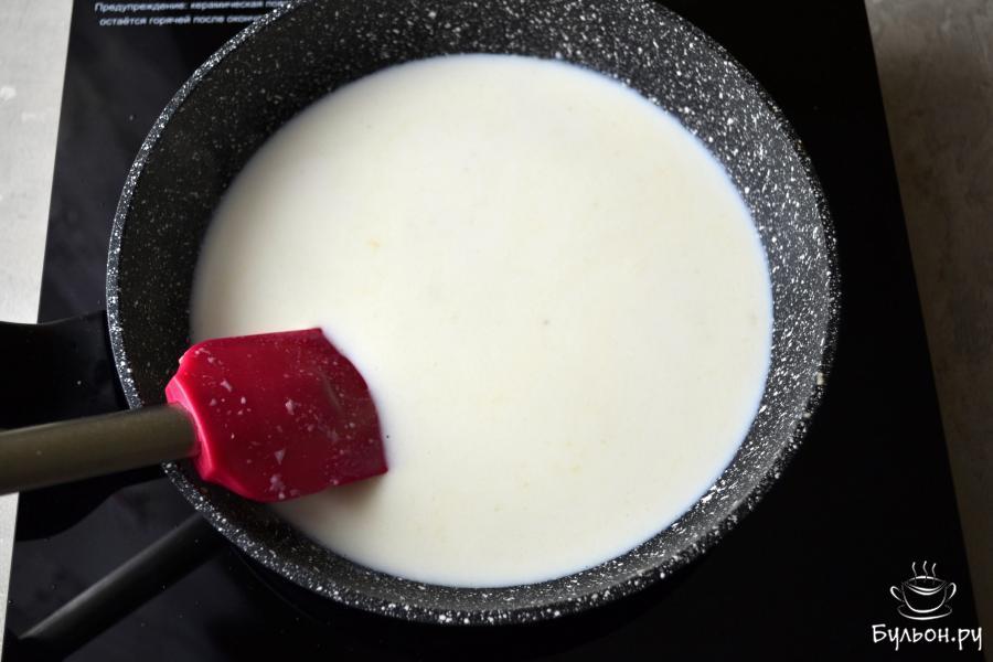 4. Когда мука полностью растворится, влейте остальное молоко и еще раз хорошенько перемешайте массу.