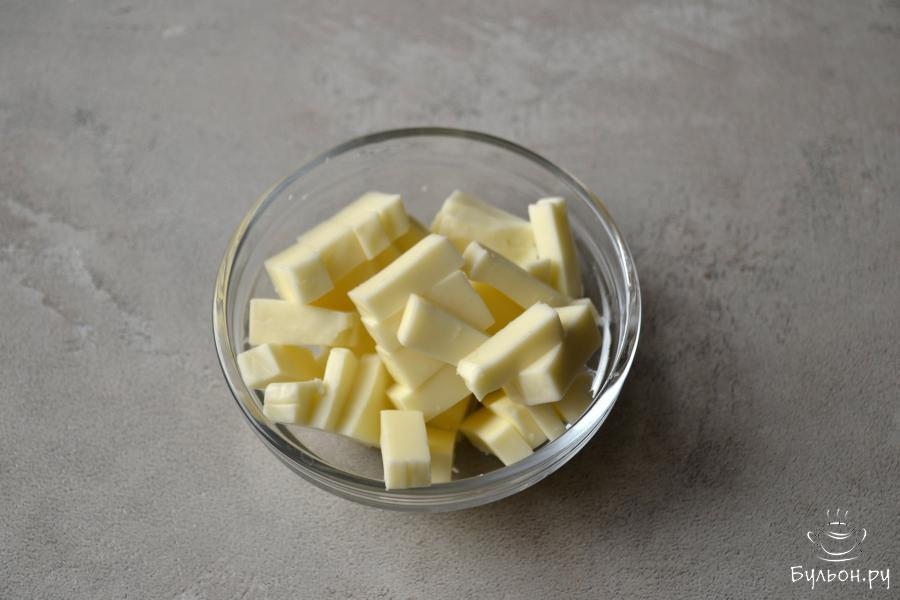 5. Сыр нарежьте мелкими кусочками или натрите на крупной терке.(В рецепте используется плавленный сыр "Карат" для супов и соусов).