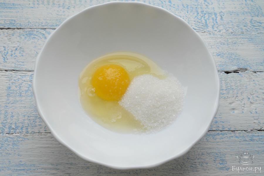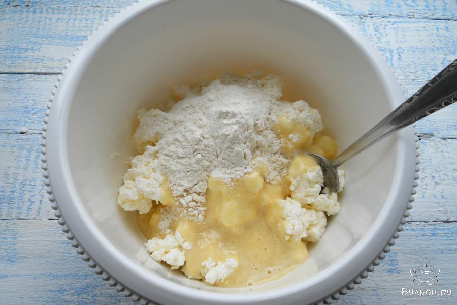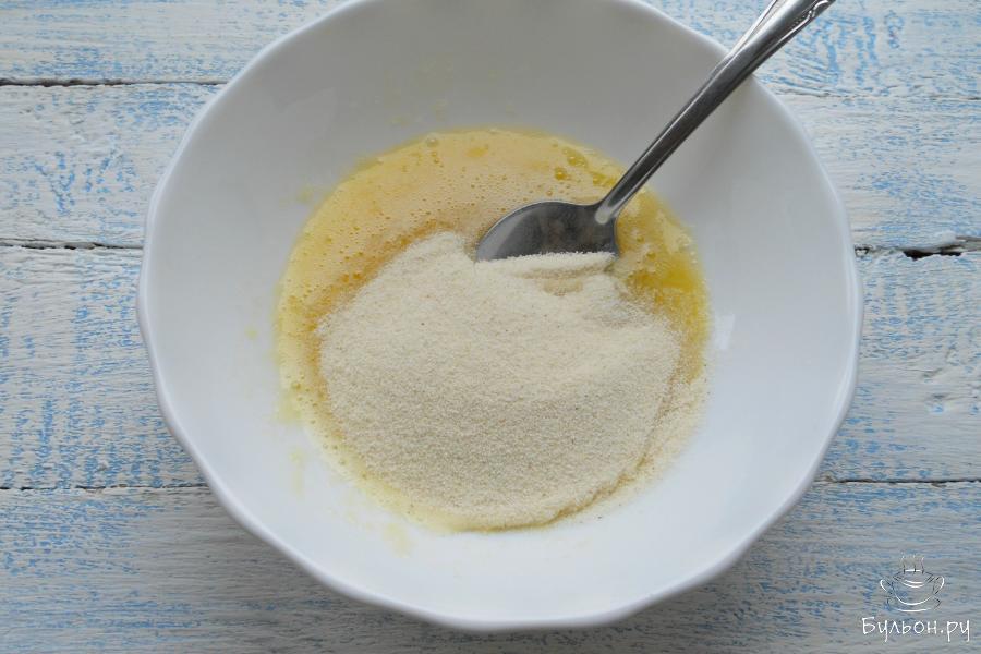 2. Хорошенько расколотить вилкой или венчиком и всыпать манную крупу. Все перемешать и оставить на 10 минут.