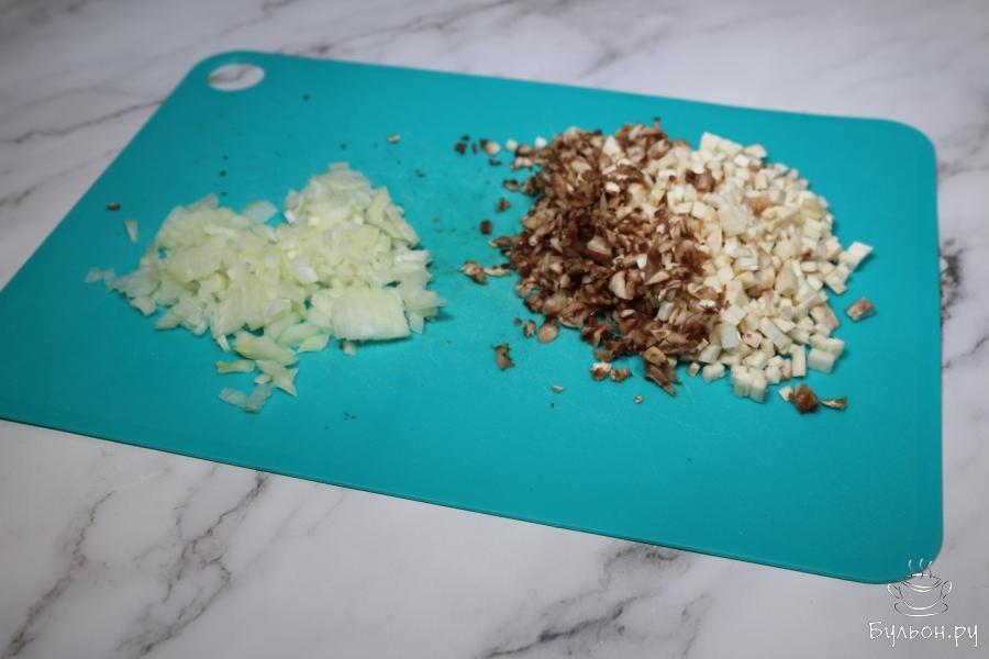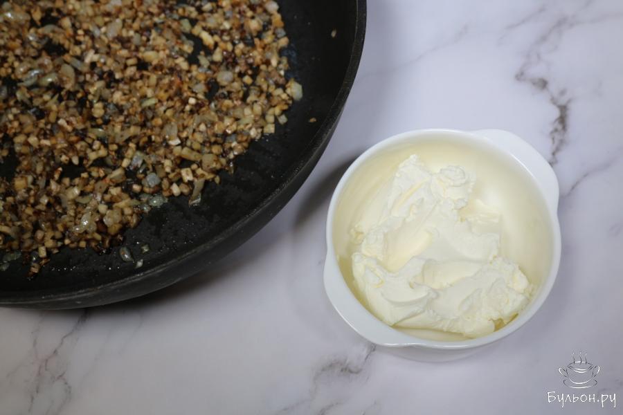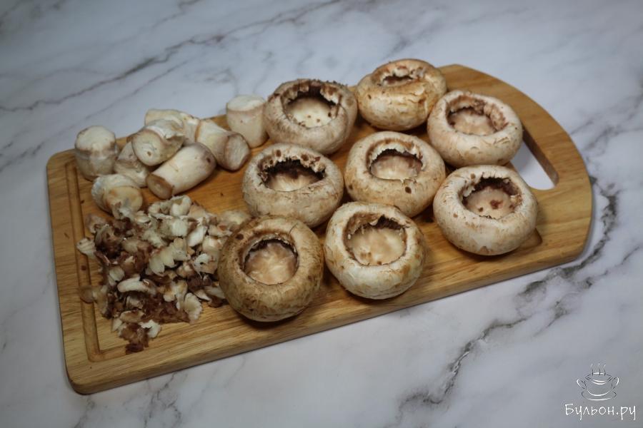 1. Первым делом отмеряем необходимое количество сливочного сыра и оставляем его при комнатной температуре, пусть прогреется и станет мягким. Это важно для вымешивания начинки. А теперь вымоем грибы и отделим ножки от шапочек, изнутри грибов достанем ложкой еще немного мякоти.