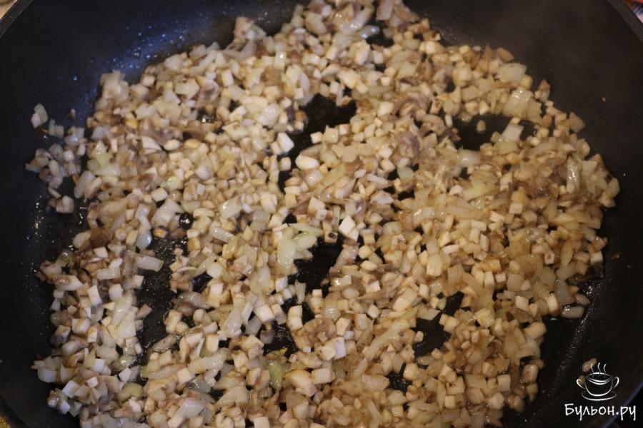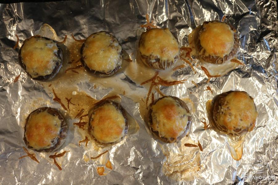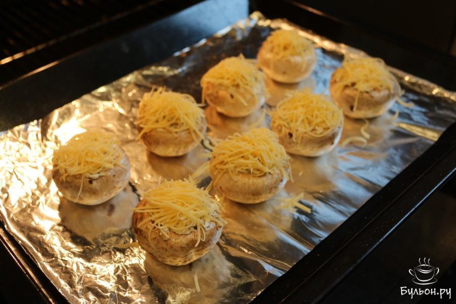 6. На противень кладем фольгу. Наполняем шапочки начинкой и сверху посыпаем тертым сыром. Подготовленные шапочки выкладываем на противень.