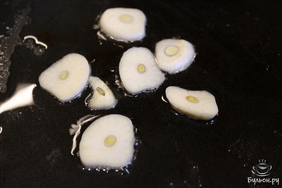 3. Чеснок режем пластинами и обжариваем его в течение минуты на сковородке с маслом. Затем чеснок выбрасываем.