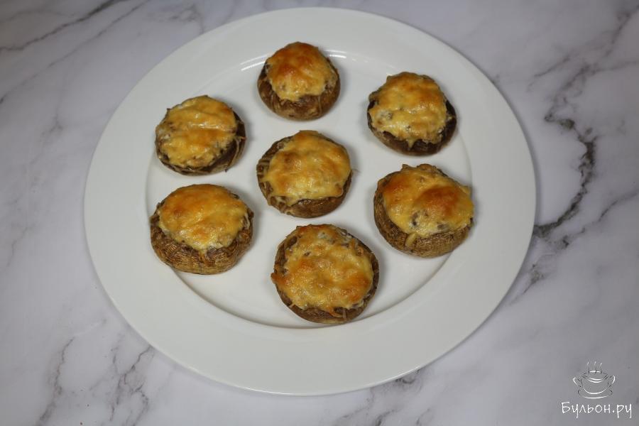 8. Готовые шампиньоны перекладываем на блюдо и сразу приступаем к их поеданию. Если вы ждете гостей, то подготовьте все заранее, а по их приходу поставьте в духовку, поскольку закуску нужно кушать именно горячей.