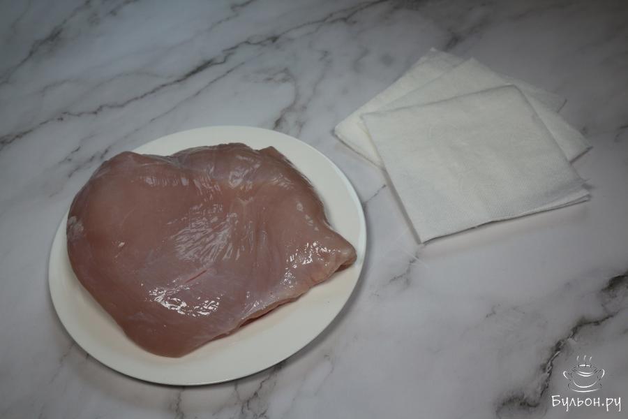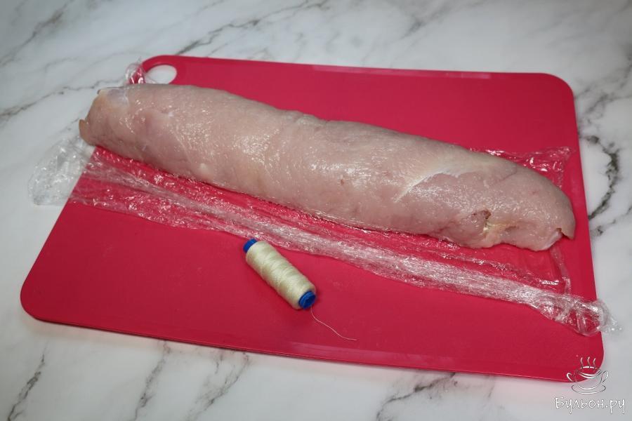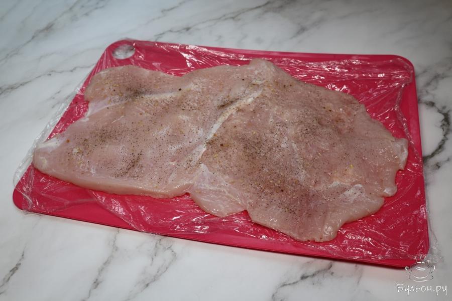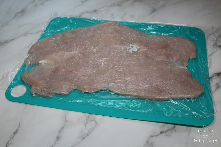 2. Далее ножом делим филе, но не прорезаем его до конца, разворачивая куски филе в разные стороны. Накрываем филе пленкой и отбиваем молотком. Толщину мяса делаем примерно в 0,5 см. Конечно, идеально ровной по всему периметру не будет, но стремимся к этому.