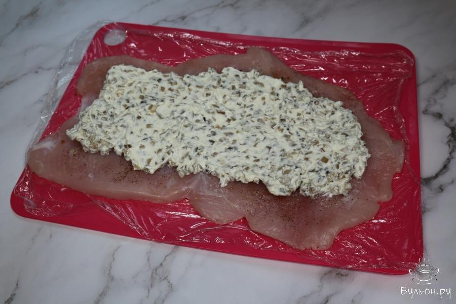 6. Выкладываем сливочно-грибную начинку на индейку, но отступаем с каждого края, они должны остаться свободными.