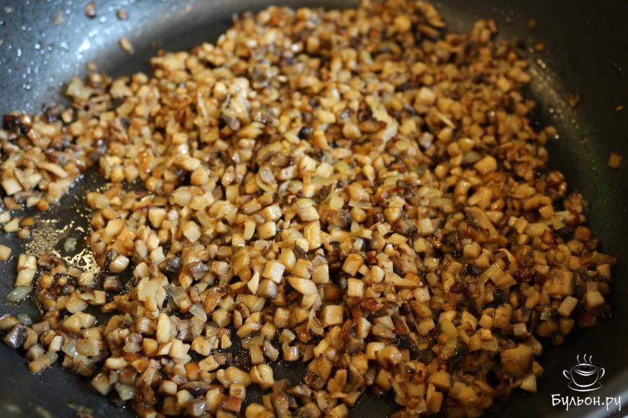 5. Отправляем овощи в сковороду, вливаем масло и жарим до золотого цвета. Затем смешиваем жаренные овощи и сливочный сыр.