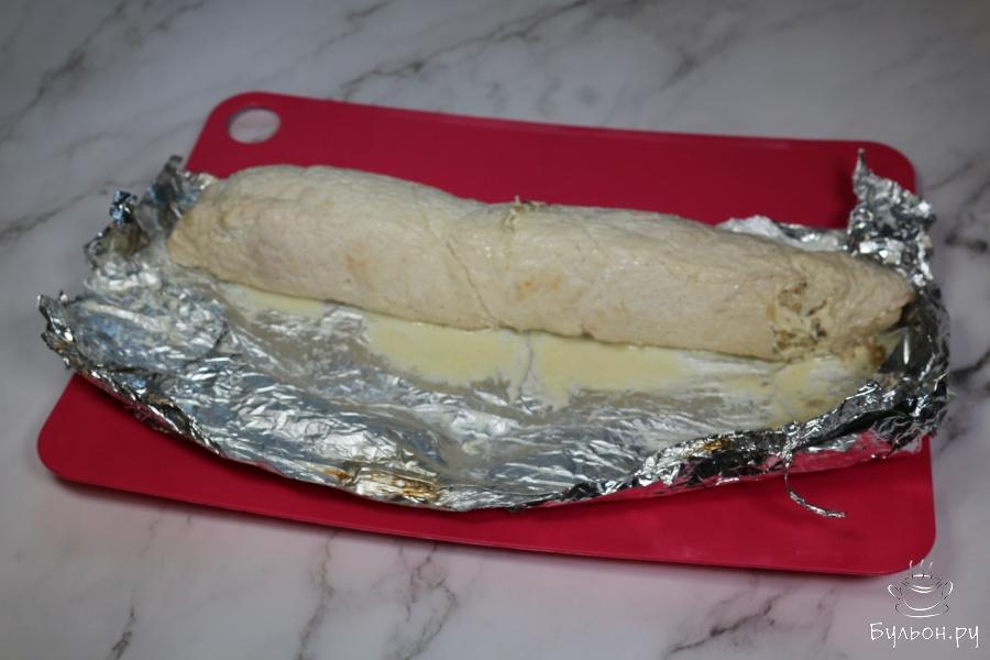 9. Печем рулет из индейки 35 минут при температуре 200 градусов. После чего освобождаем его от фольги. Рулет готов.