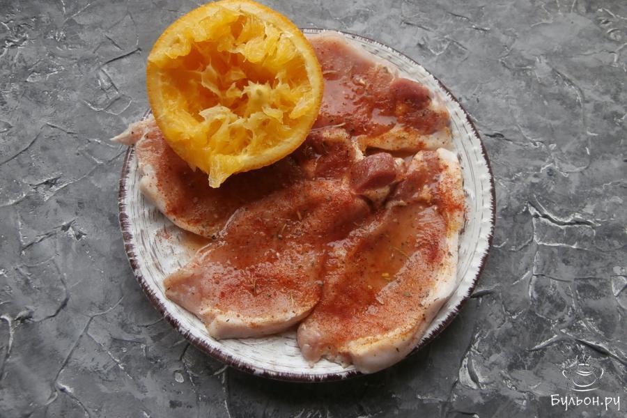 3. У очень крупного апельсина отрезать третью часть, выдавить сок прямо на мясо. Пальцами свинину помассировать, перевернуть и поместить в холодильник для маринования часа на 2.