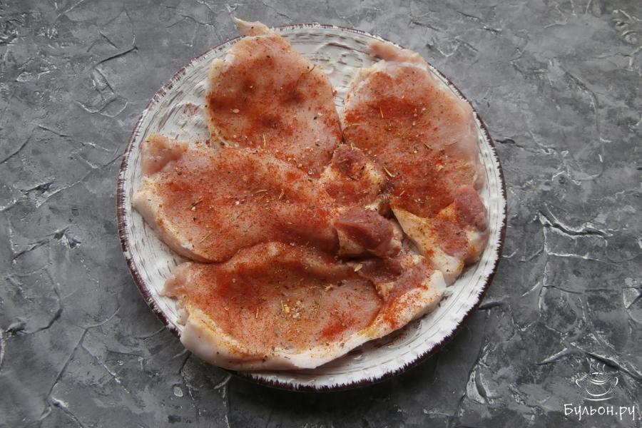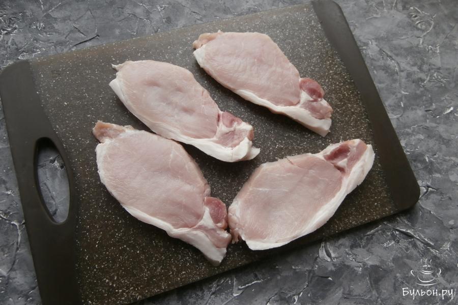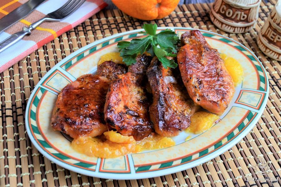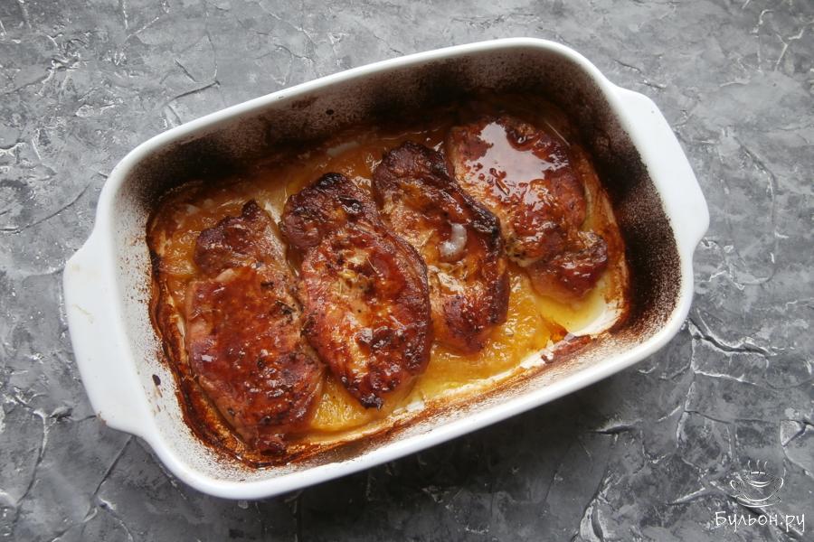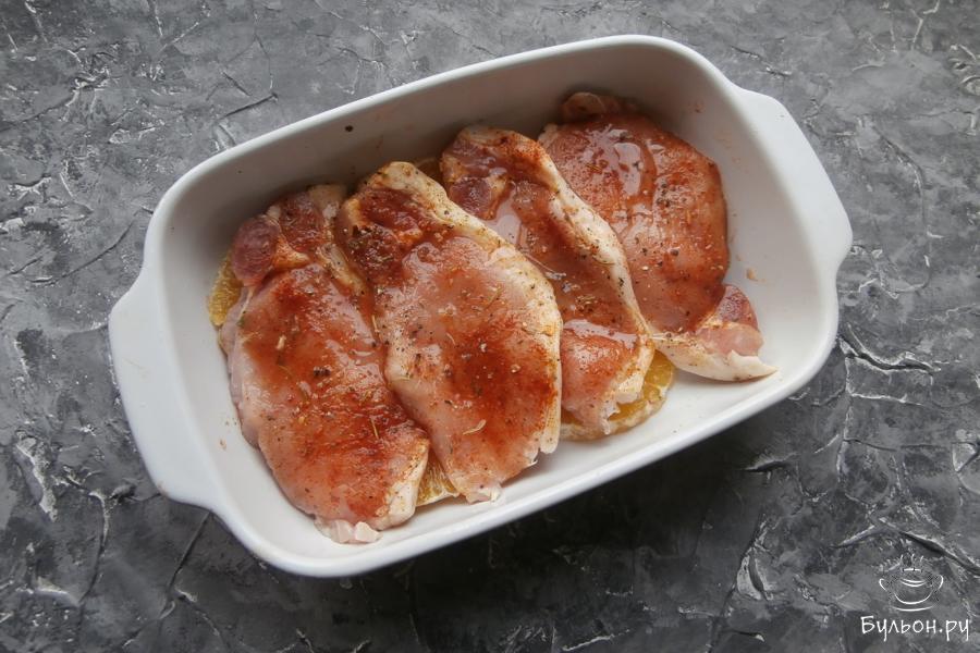 4. Оставшуюся часть апельсина очистить от кожуры, порезать кружками, выложить в форму для запекания. На апельсинах разместить стейки свинины. Сверху полить их немного оливковым маслом.