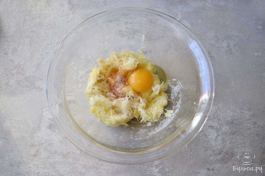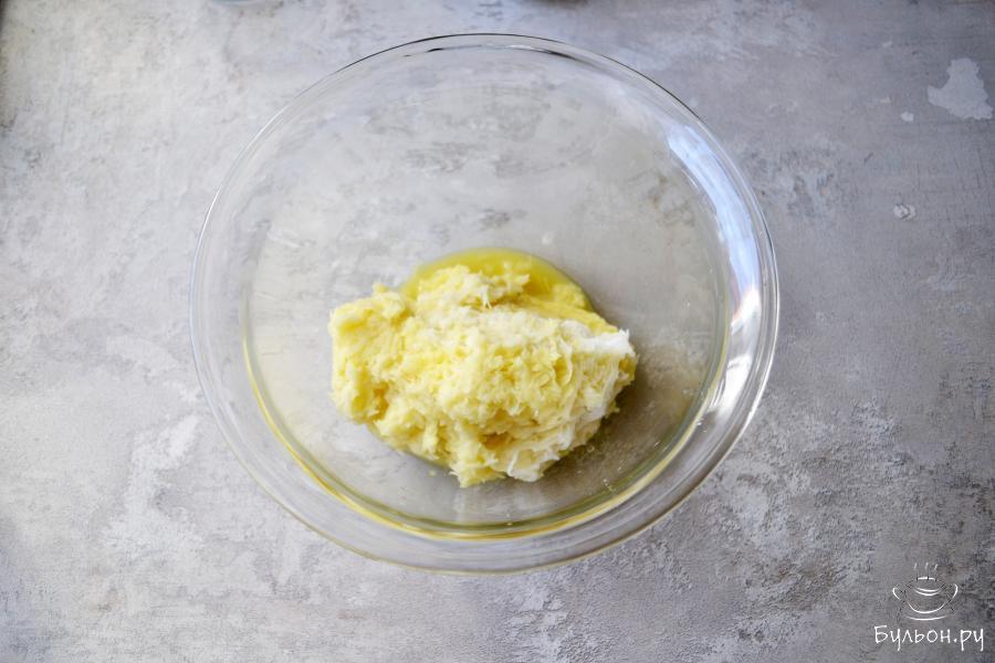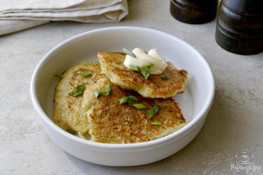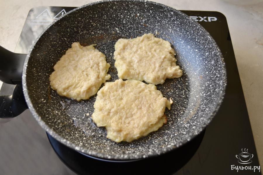6. Разогрейте сковороду с растительным маслом и столовой ложкой положите картофельное тесто на сковороду, формируя оладьи. Сделайте огонь ниже среднего и обжаривайте до золотистой корочки.