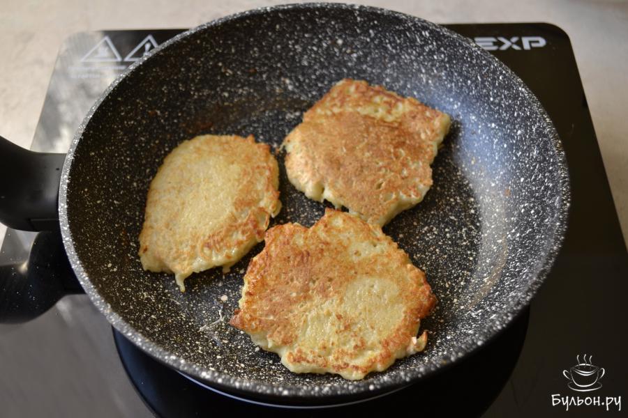 7. Затем драники переверните и обжаривайте до готовности. Можно готовить под крышкой или переворачивать драники несколько раз, чтобы они равномерно и красиво поджарились.