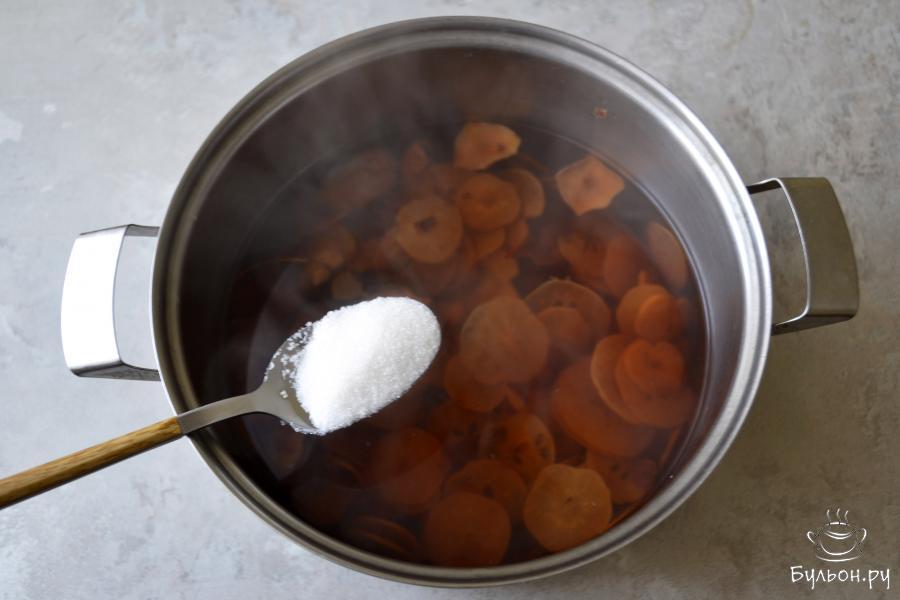 5. В конце варки добавьте сахар по вкусу, отключите нагрев и оставьте компот на 30-60 минут для настаивания.