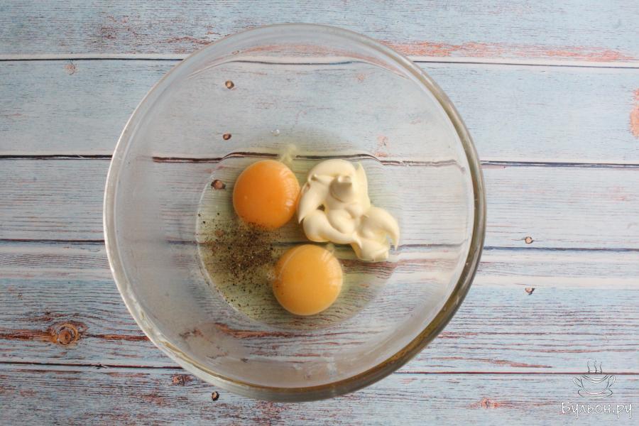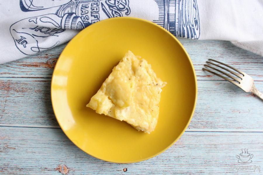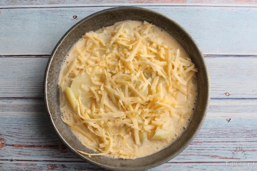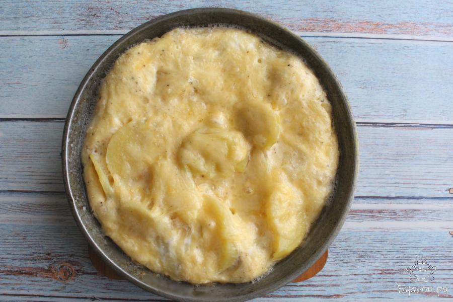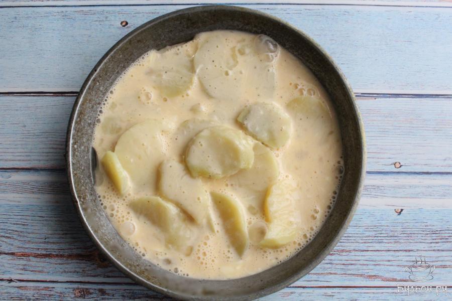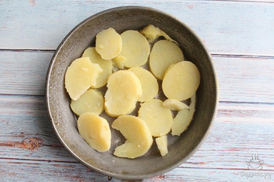 1. Вареный картофель нарежем не очень тонкими кружочками или полукружочками. В форму для запекания или сковороду наливаем масло и выкладываем картофель.