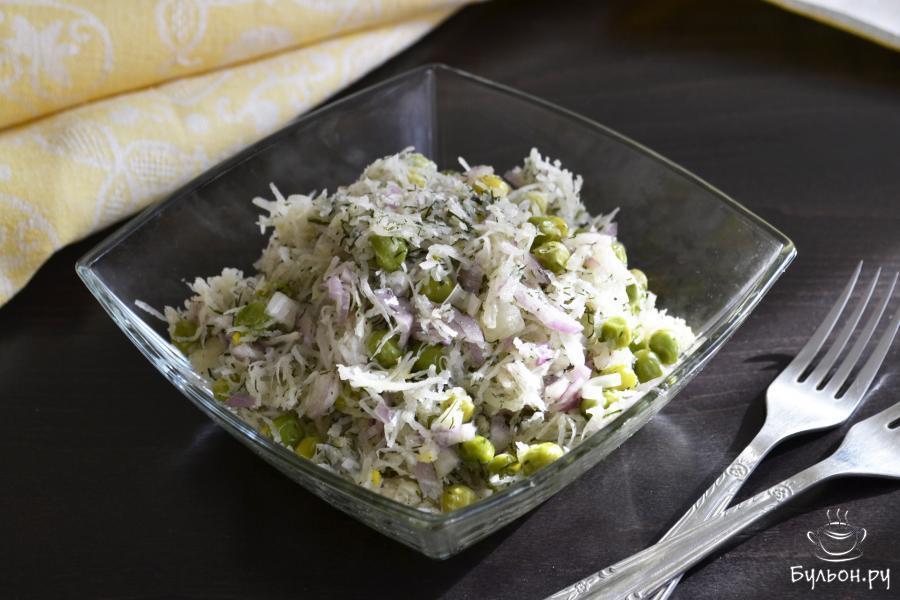 Салаты из редьки разжигают аппетит. Кроме того, что они полезные, салаты очень вкусные, пикантные. Редька в салатах хорошо сочетается, как с овощами: луком, морковью, зеленым горошком, так и с мясом, например, с говядиной. Салат с горошком и луком лучше всего заправлять не рафинированным подсолнечным маслом. Горошек можно использовать консервированный или замороженный, который нужно заранее отварить в течение нескольких минут. Редьку можно использовать черную или зеленую, которая менее острая.