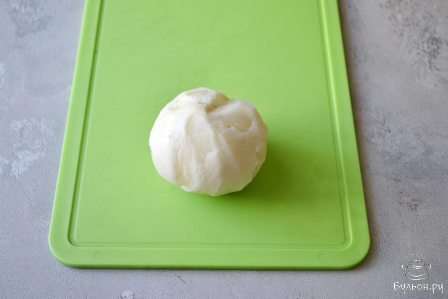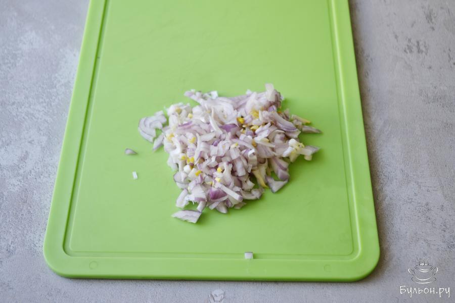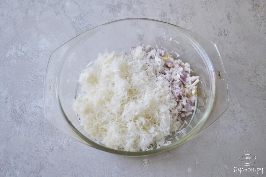 4. В салатник положите нарезанный лук. Руками отожмите сок с редьки и добавьте ее к луку в салатник.