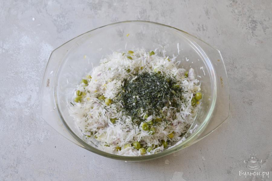 7. Перемешайте редьку с луком и горошком и добавьте укроп, свежий или замороженный. Перемешайте и полейте салат подсолнечным маслом.