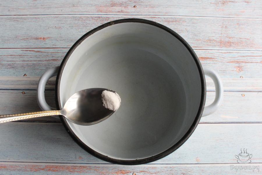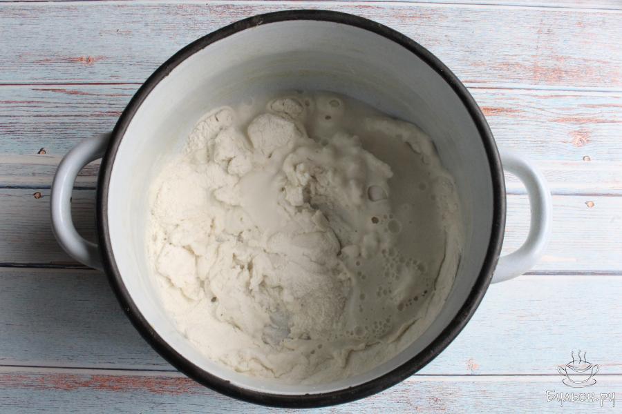 2. Убираем посуду с водой с огня и сразу примешиваем муку. Мешаем тесто ложкой, а когда оно остынет, будем вымешивать руками.
