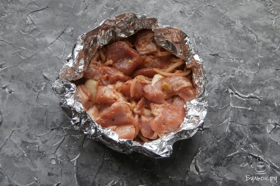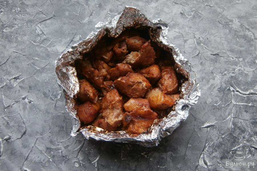 6. Далее, из фольги, сложенной вдвое сформировать что-то подобное мисочке, выложить туда маринованное мясо.