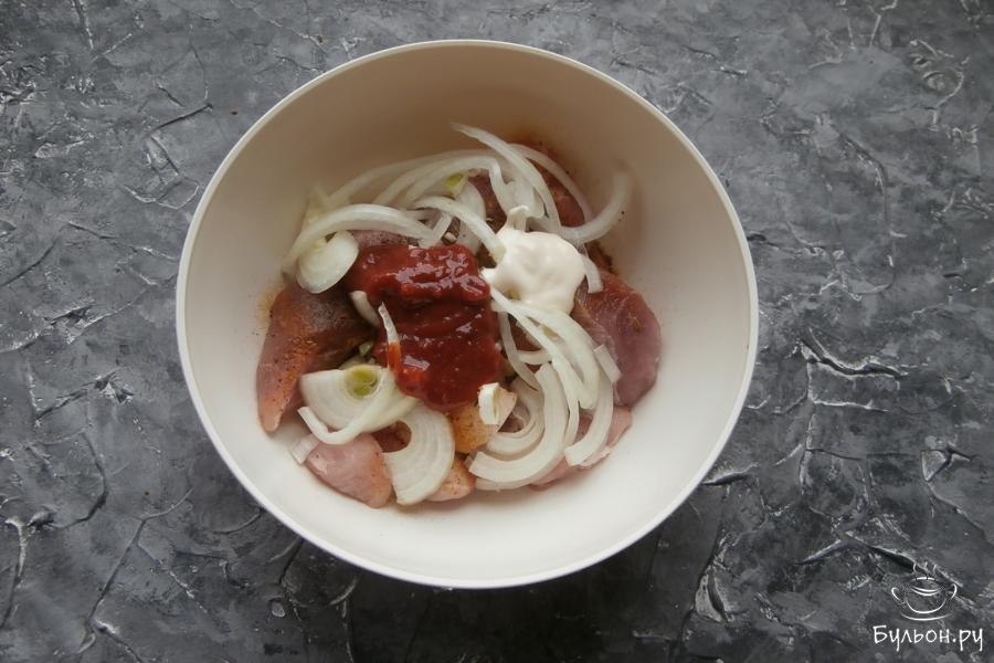3. Добавить порезанный полукольцами крупный репчатый лук, кетчуп или вкусный томатный соус, майонез.