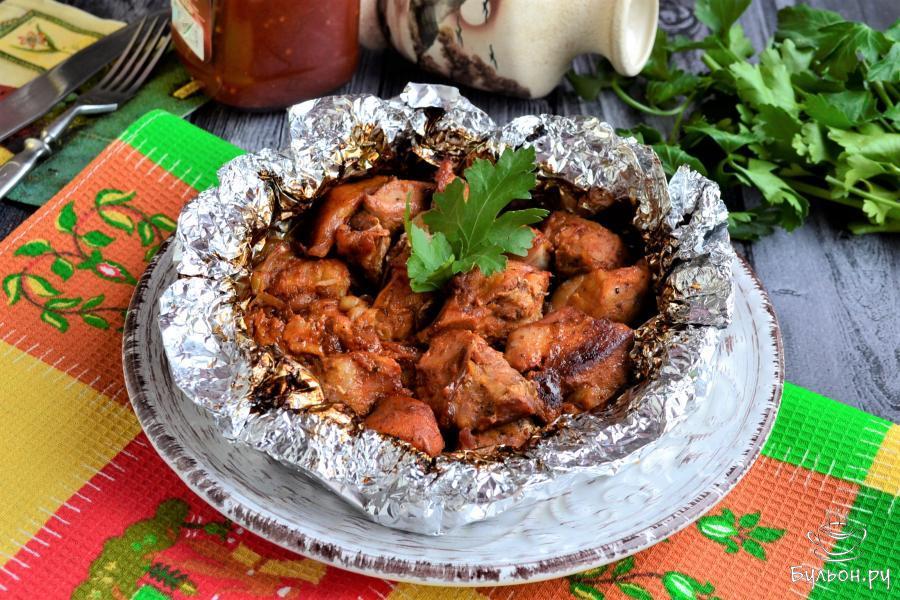 На улице холодно, сыро и идет дождь, нет возможности выехать на природу, а шашлыка хочется - не беда, его можно приготовить в духовке в фольге. Получается шашлык необычайно вкусным, сочным и практически не отличается от приготовленного на мангале (ну возможно чуточку). Если у вас есть еще в наличии и жидкий дым - вообще супер. Лучше всего брать для шашлыка шейную часть свинины, но можно и любую, мариновать мясо следует не менее 3 часов. Рекомендую попробовать такой шашлык, уверена, вам он точно понравится.