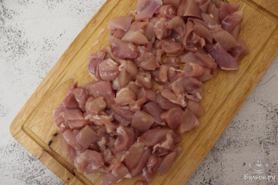 2. Следующим шагом, куриное мясо порежем. Резать мелко не надо, так как мясо мы еще будем измельчать.
