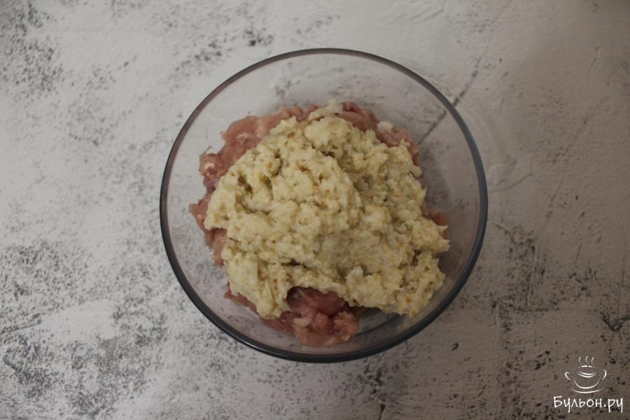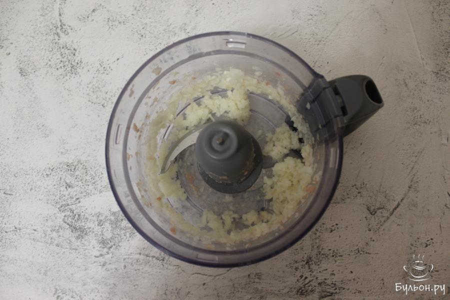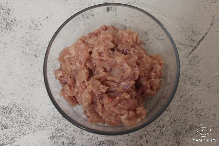3. Для этих котлеток я рекомендую измельчить нарезанные кусочки куриного филе с помощью блендера. Однако, можно измельчить через мясорубку. Измельченное мясо переложим в мисочку.