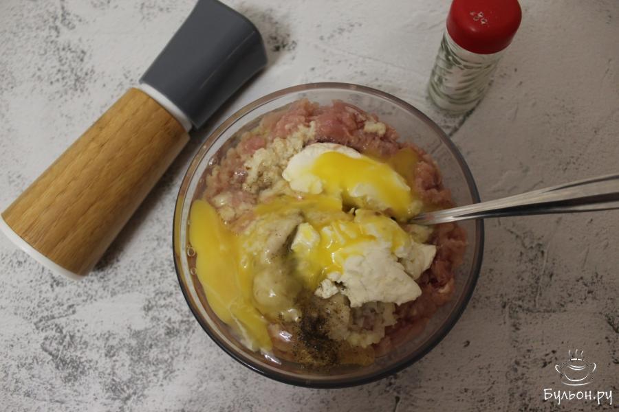7. Разобьем в миску яйцо категории С1, добавим сливочный сыр, поперчим и посолим. Массу перемешаем и отправим на 20 минут в холодильник.