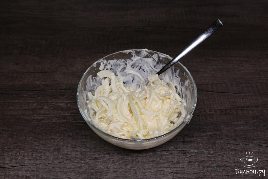 2. Теперь маринуем лук. В миску выкладываем лук, добавляем майонез, вливаем уксус 9%, посыпаем солью. Хорошо все перемешиваем, накрываем пленкой и маринуем минимум 2 часа.