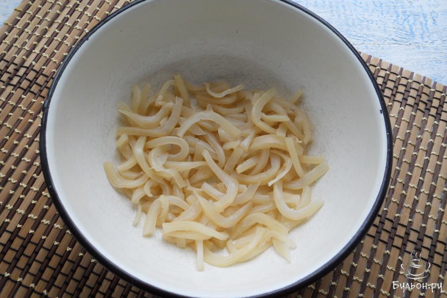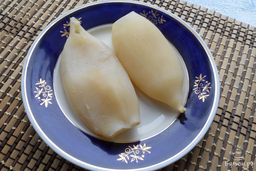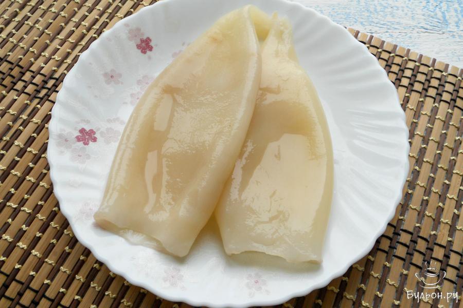 3. Чтобы кальмары были мягкими и не стали резиновыми, их варить не нужно. Довести воду с кальмарами до кипения, выключить газ. Накрыть кастрюлю крышкой и оставить кальмары в воде до теплого состояния. Готовые кальмары выложить на тарелку и дать им полностью остыть.