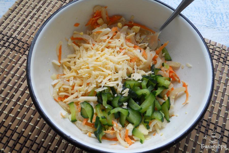 7. Сюда же добавить натертый на крупной терке сыр и порезанный соломкой или брусочками свежий огурец.
