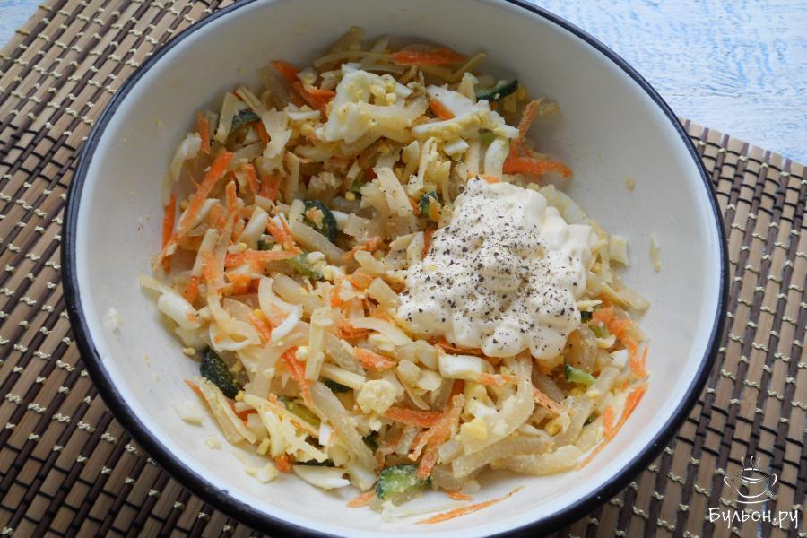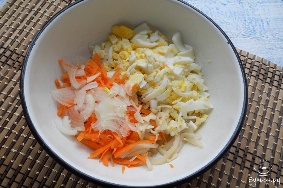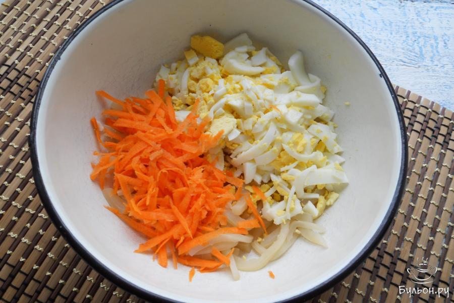 5. Яйца отварить и очистить, порубить ножом. Морковь натереть на крупной терке. Добавить морковь с яйцами к кальмарам.