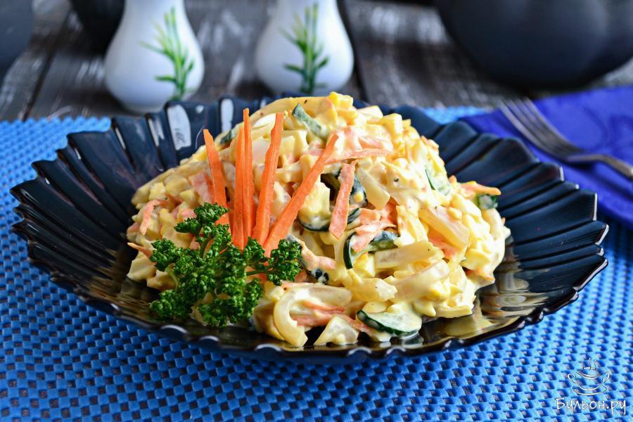 9. Выложить очень вкусный салат из кальмаров с сыром в салатник, украсить и подать к столу. Приятного аппетита.