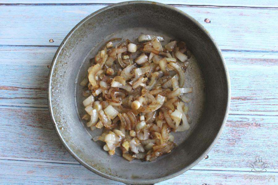 3. Лук почистим, промоем и мелко нарежем. Тушим лук до мягкости на разогретом масле несколько минут.
