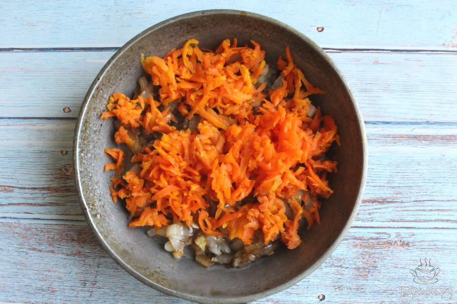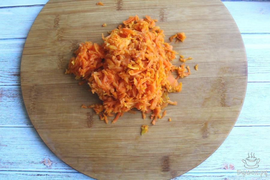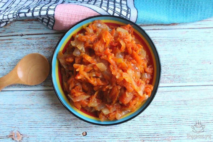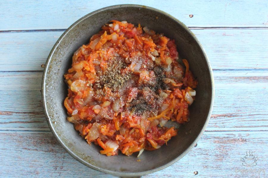 5. Помидор перетираем через крупную терку, добавляем к овощам. Если у вас нет под рукой помидора, то можно заменить его на томатную пасту или кетчуп. Если используем томатную пасту, то немного разбавляем ее водой.