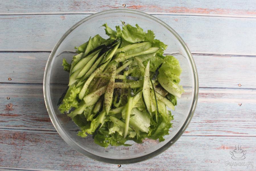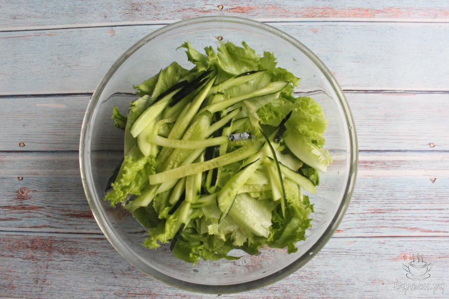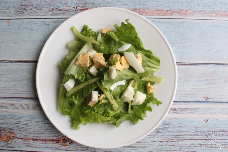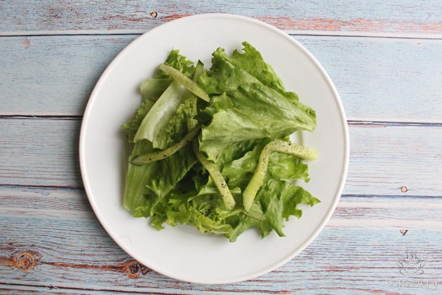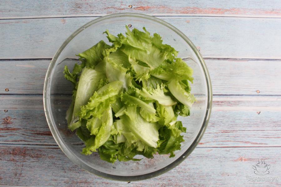 1. Листья салата промоем, хорошо обсушим и порвем руками. Салатные листья лучше не резать ножом, так они дольше остаются пышными и не пускают сок.