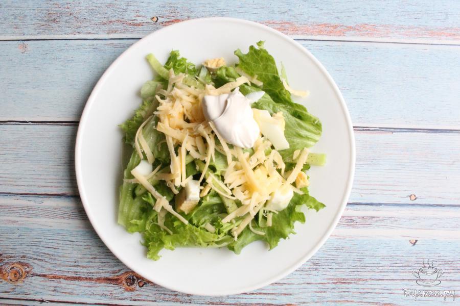5. Яйца варим вкрутую 10 минут после закипания воды, остудим их и почистим. Нарежем яйца крупными кубиками и выкладываем их на салат в каждую порцию.