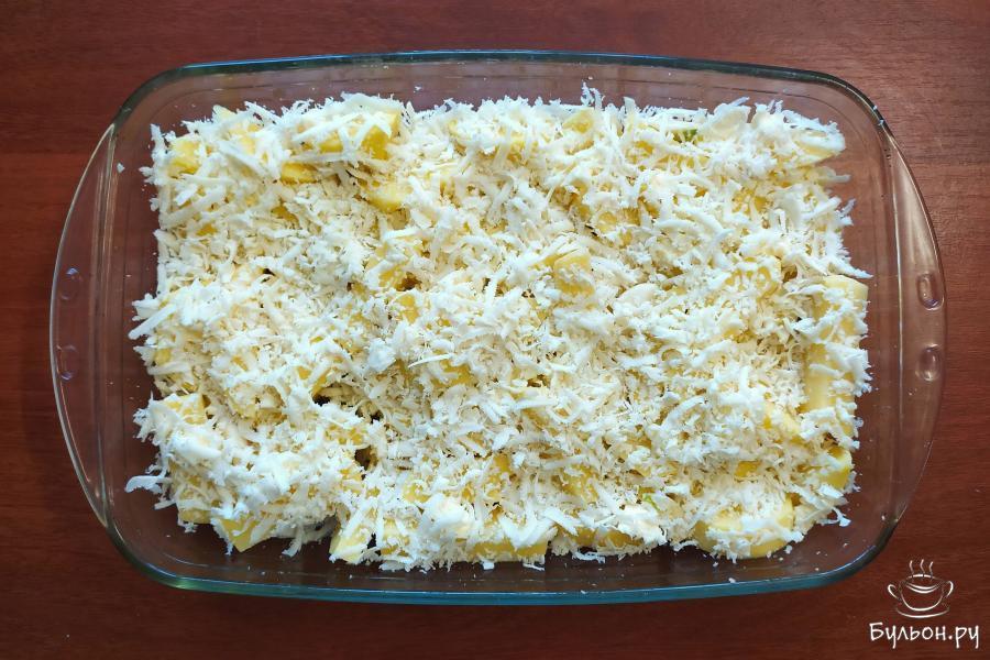 6. Сыр потереть на картофель. Накрыть плотно фольгой и отправить в духовку. Готовить блюдо примерно 40 минут при 180 градусах до готовности картофеля. При протыкании картофель должен быть мягким.