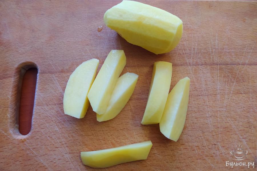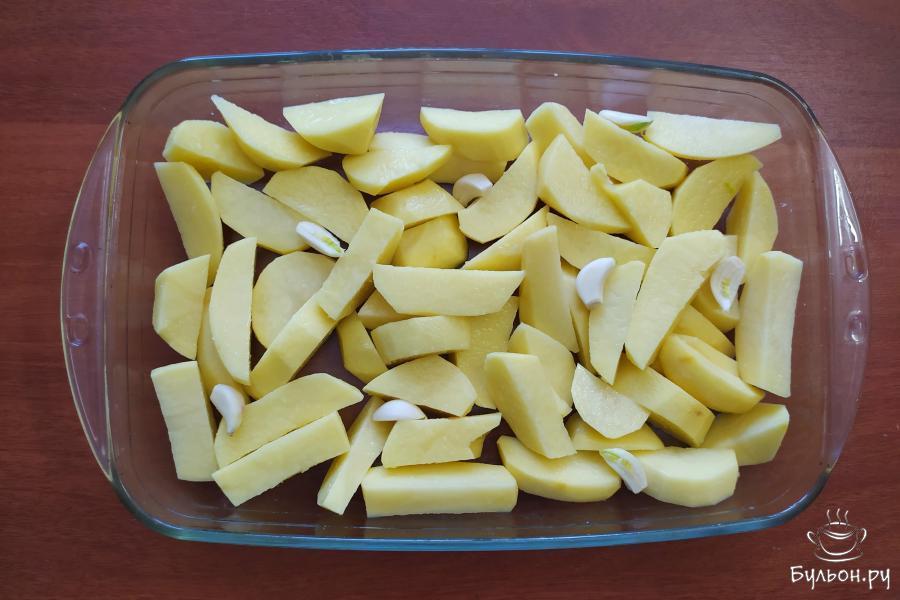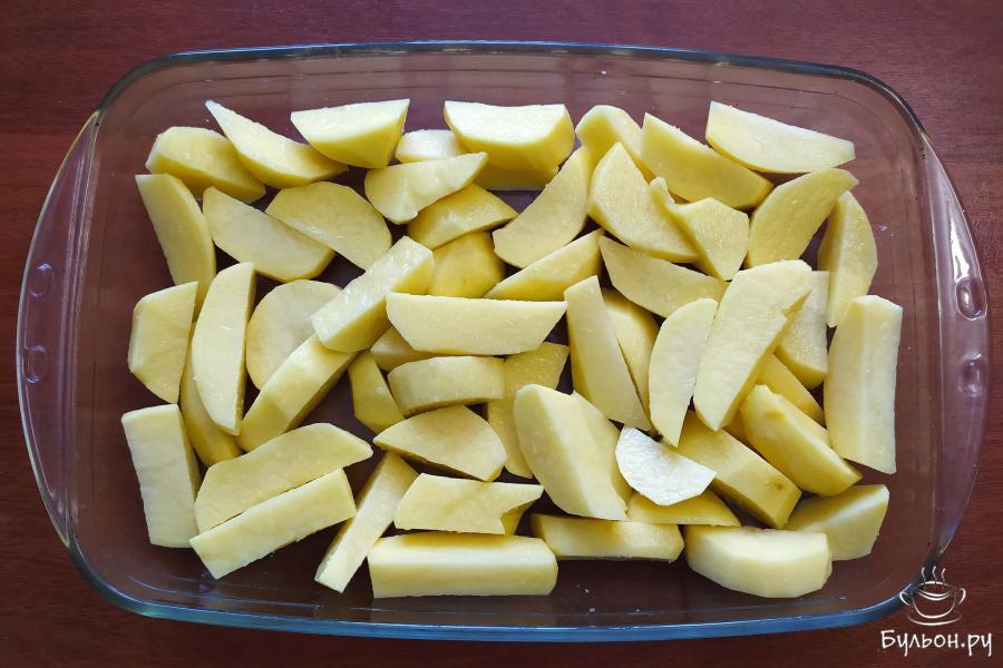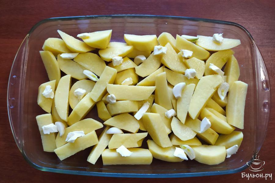 3. Форму 20х30 см. смазать растительным маслом. Выложить подготовленный картофель. Посолить и перемешать.